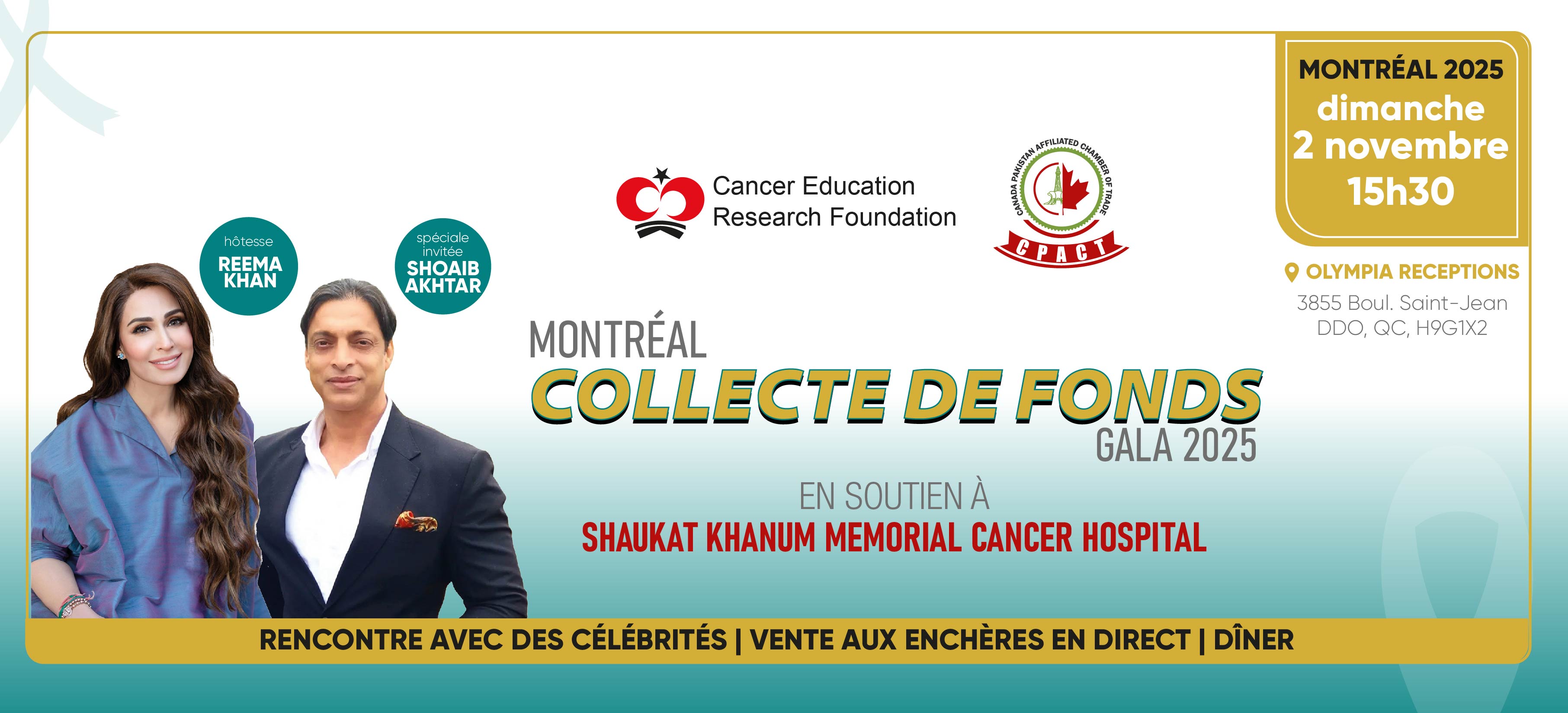 Rejoignez le CPACT, en partenariat avec l’Hôpital Memorial du Cancer Shaukat Khanum (SKMCH), pour le Gala-bénéfice de Montréal le dimanche 2 novembre 2025 à 15 h 30 — une soirée inspirante dédiée à la recherche et à l’éducation sur le cancer. Vivez une nuit inoubliable comprenant une vente aux enchères en direct, une rencontre avec des célébrités et un dîner élégant au profit d’une noble cause. Ensemble, « Levez la main » et « Faites un don » pour aider à compléter le troisième Hôpital Memorial du Cancer Shaukat Khanum, en unissant les communautés dans la lutte contre le cancer et en bâtissant un avenir plus sain pour tous.